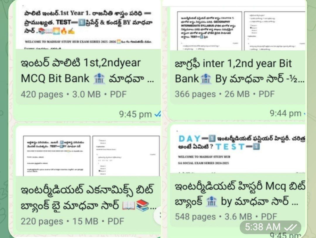 ఇంటర్మీడియట్ ఫస్ట్ ఇయర్ & సెకండ్ ఇయర్ MCQ BIT BANK 🏦 PDF BY. మాధవా సర్ 📖📚🔥 1. జాగ్రఫీ ( 1650 bits) 2. ఎకనామిక్స్ ( 600+)బిట్స్ 3. హిస్టరీ (1117 BITS ) 4. పాలిటి (866బిట్స్) Total గా ఇంటర్మీడియట్ సోషల్ 4233 MCQ BITS 👌🗒️🗓️🌊 Total గా 4233 mcq బిట్స్ ఉన్న bit banks App లో అందుబాటు లో ఉంది. ధన్యవాదాలు ఇట్లు మీ మాధవా
